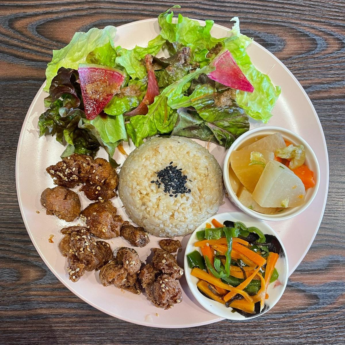 Lunch was a classic Japanese set meal with crispy fried soy meat, pickled veg, steamed vegetables, rice and salad. Simple but tasty, usually ¥1400 but you receive a ¥300 discount if you also visit the cats. Would recommend!