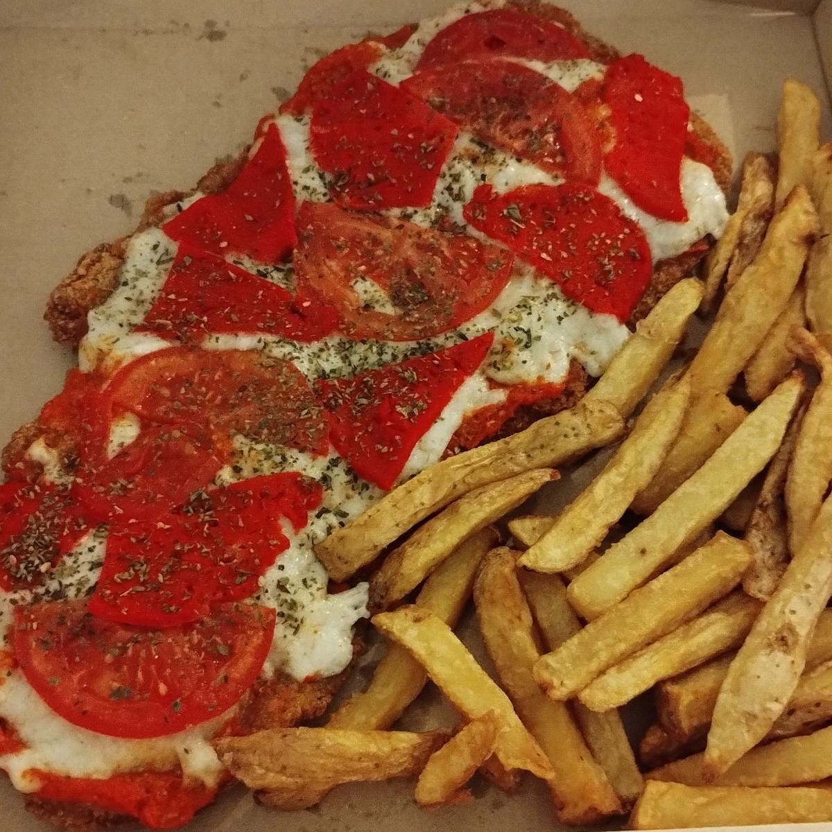 Mila de seitán frita, con salsa de tomate, muzzalmendra, tomate, morrones asados y orégano, con papas fritas.