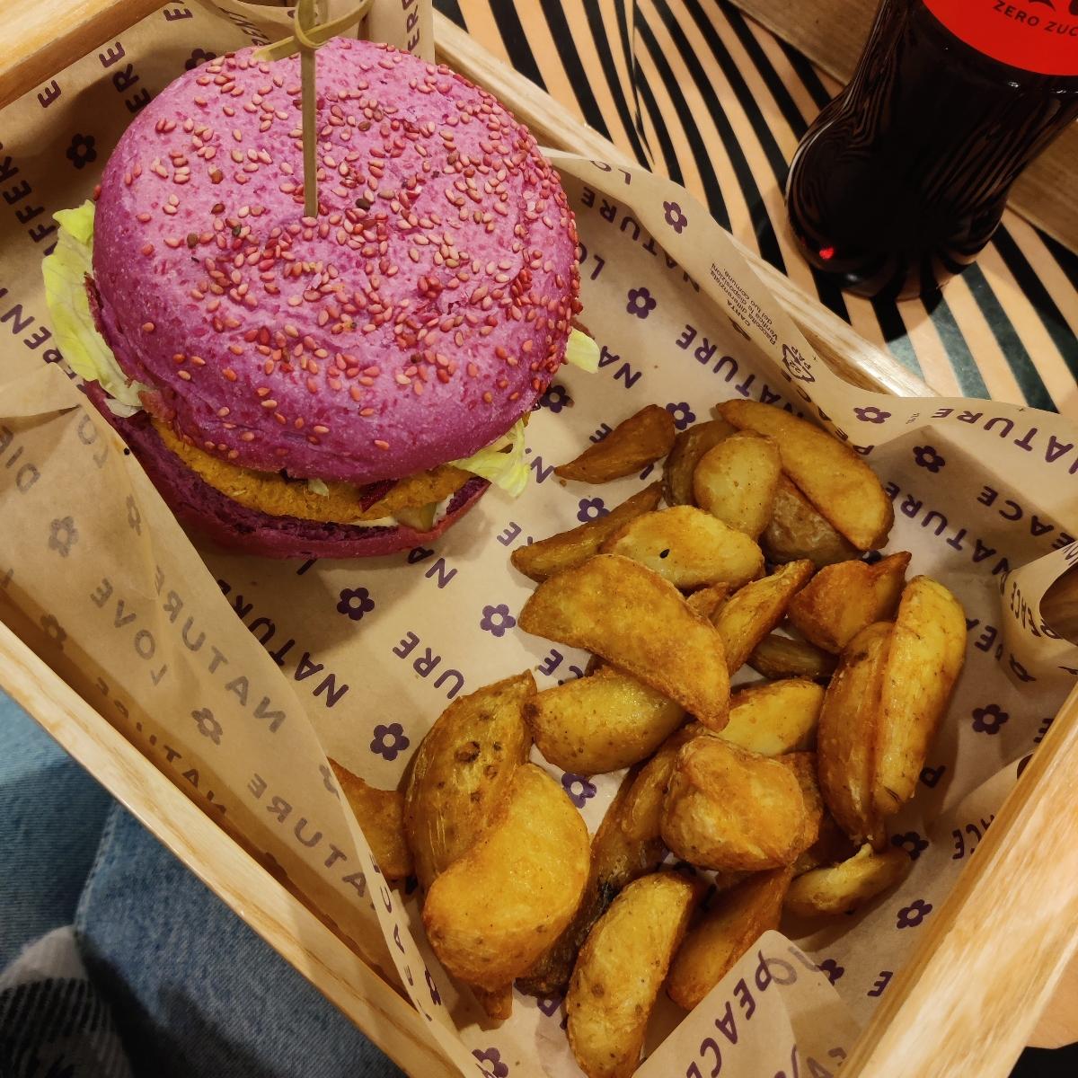 Ebbene si, l'ho scelto solo perché era della limited edition Hello Kitty, ma alla fine mi è piaciuto moltissimo! Ha tanti elementi dolci perché ha il burger di zucca e anche alcune fettine di mela, però è tutto perfettamente bilanciato dal cavolo rosso e soprattutto dalla salsa smoky che lascia un aroma di affumicato intenso. Buonissimo!