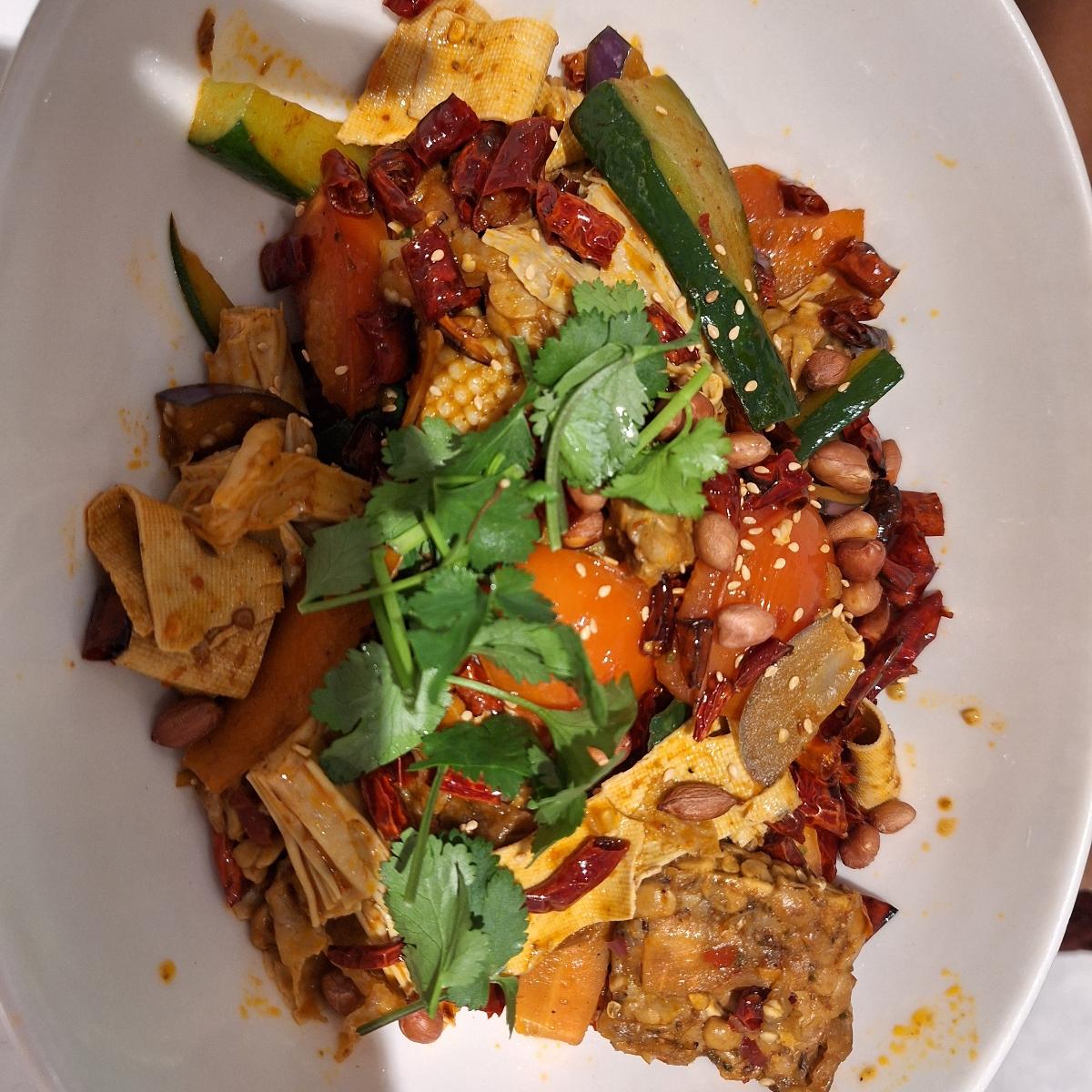 Mala Xiangguo is a Chinese dish that originates from the Sichuan province. It is a spicy and flavorful dish that combines the heat of Sichuan peppercorns with the numbing sensation of Sichuan peppercorns. The dish is typically served with a variety of ingredients such as vegetables, tofu, and mock meats, all tossed together in a fiery, spicy broth. It's a bold and flavorful dish that is perfect for those who love spicy heat. Some reviews mention that the dish can be addictive and that the flavors are intense. Overall, Mala Xiangguo is a popular dish that is loved for its bold flavors and spicy heat.