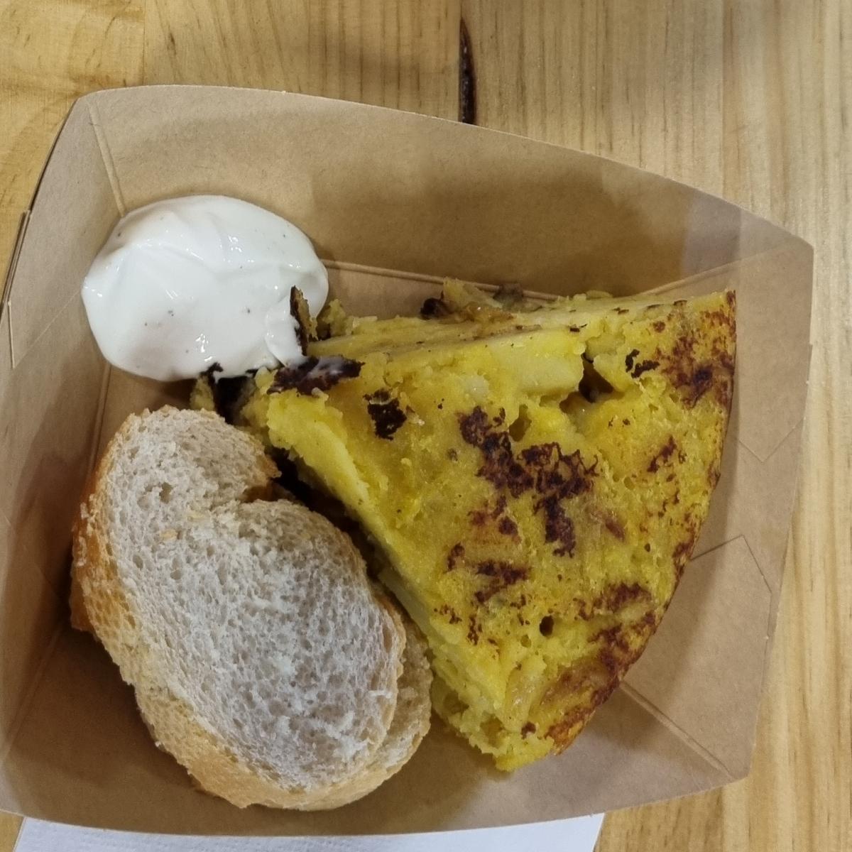 Pincho de tortilla che viene servito con pane e salsa. Molto buono