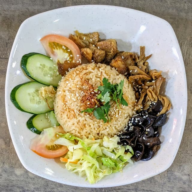 Daily special not in the regular menu! The #organic brown rice was topped with fragrant fried shredded ginger, alongside toothsome lion's mane mushrooms and abalone mushrooms in some kind of sweet and savoury teriyaki-like sauce, crunchy yet tender black fungus in sesame oil, as well as cabbage, cucumber, and tomato. 🍚🍄🟫🥬🥒🍅 Served with their signature housemade chilli sauce. 🌶️ (Allium-free, $6.80) #sgvegan #chinesefood #alliumfree #wholefoodplantbased #wfpb