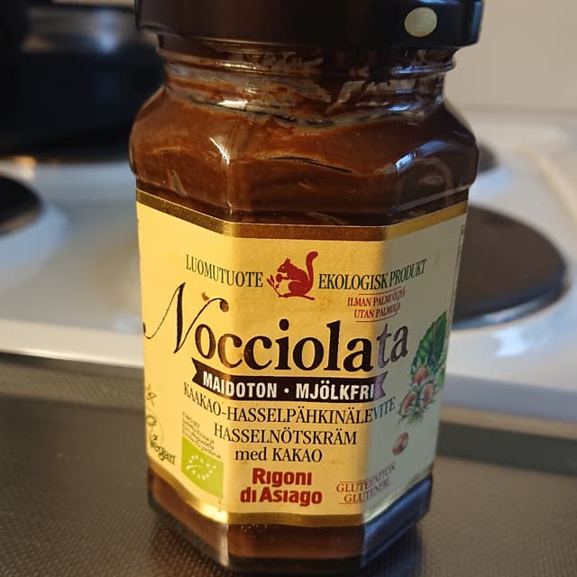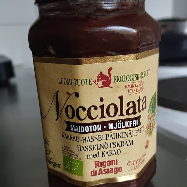 Hazelnut-chocolate spread. Basically vegan Nutella. Its organic, gluten free and no palm oil used. Great on top of bread, oatmeal or pancakes for example.