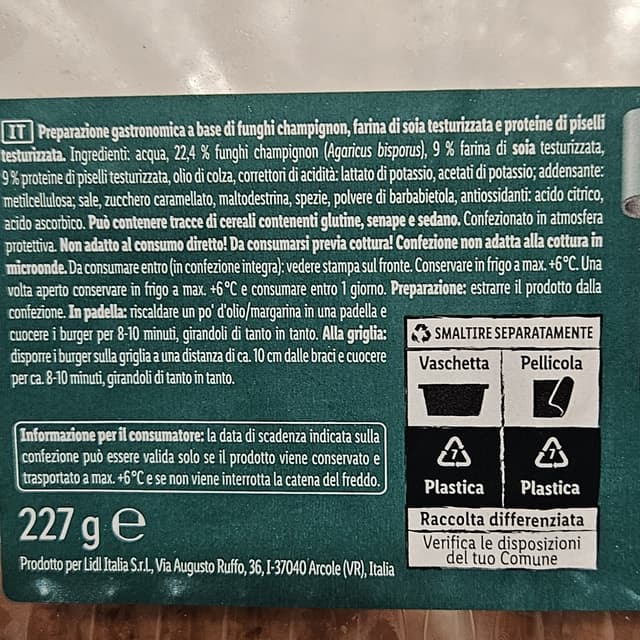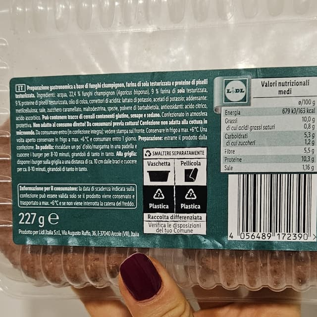 Burger tipo fake meat a base di soia, piselli e funghi. Il sapore non è male ma non si avvicina per niente alla carne. Magari in un panino con salse e formaggi si camuffa bene. In ogni caso mi è piaciuto anche si sentono le spezie quindi faccio fatica a digerirlo.