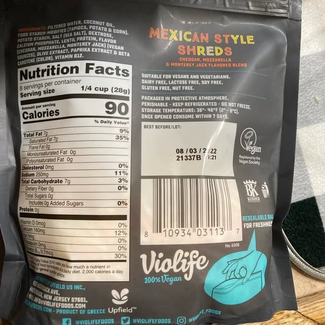 Violife has to be my favorite cheese that I’ve tried so far. The Mexican shreds taste great and was very easy to melt on my taco shells and in a beyond meat and bean enchilada! Only complaint is bag could have held more for the price and sadly not super available like the cheddar and mozzarella kind I’ve found.