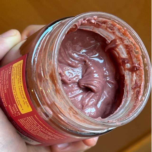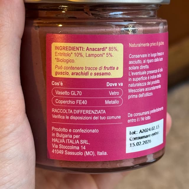 Le creme di questo brand sono davvero super. Questa è molto particolare, acquistata durante una fiera veg. Si sente il sapore acidulo del lampone che contrasta quello dolciastro degli anacardi. Per me super buona! E anche il colore della crema è top🥹