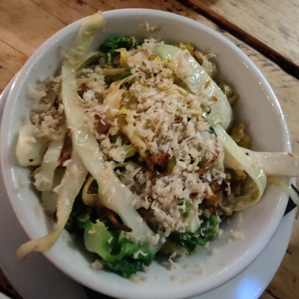 We got these greens đź’š to share with our stews. They didn't look that green at first look, but under the breadcrumbs there was lots of lovely cabbage.