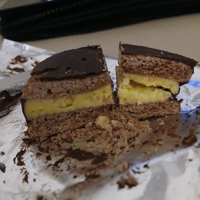 Alfajor con mousse de limón, bañana en chocolate. La galleta es rica, la mousse parece radiactiva pero no le sentí tanto el sabor a limón. #alfajor #mousse #limon