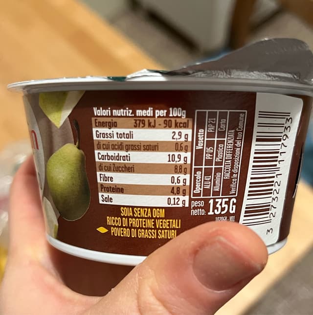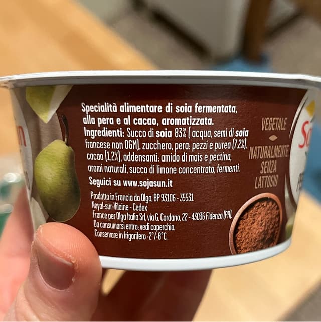 Yogurt di soia al gusto pere e cioccolato. Il cacao non è forte, sembrava quasi che fosse stato aggiunto del cacao in polvere nello yogurt bianco.