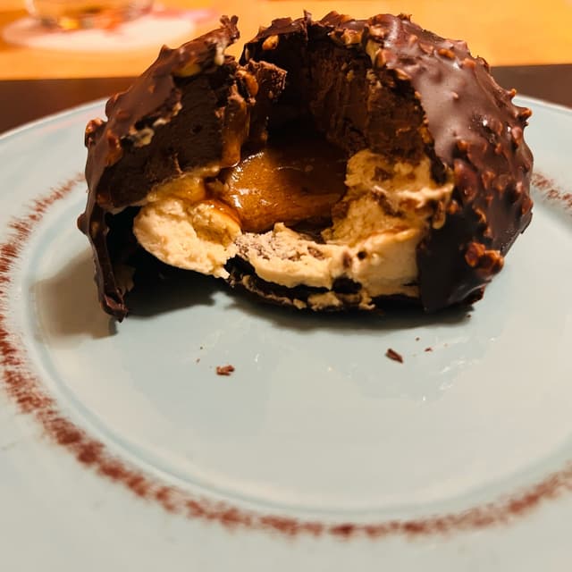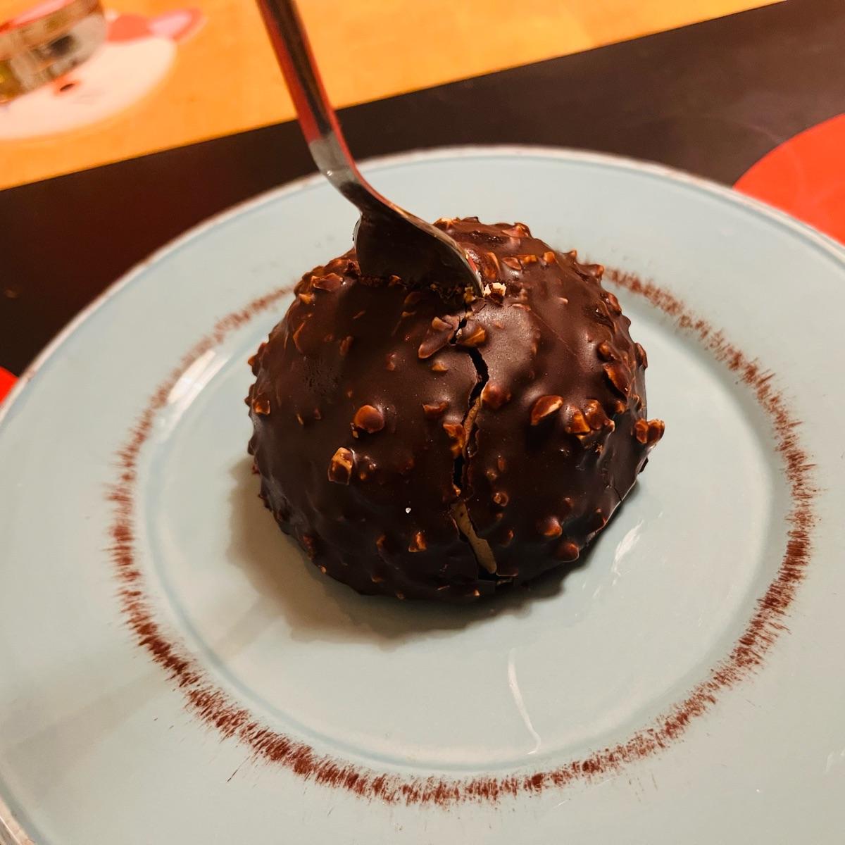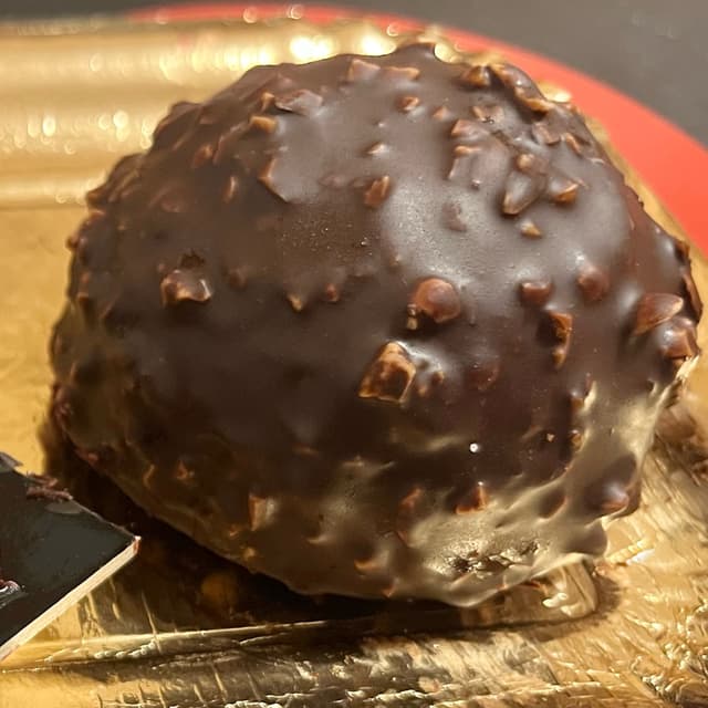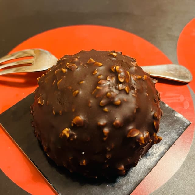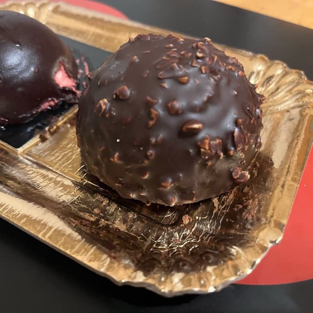 Mousse al cioccolato fondente, bavarese con vaniglia del madagascar e nocciole di giffoni, inserto con pralinato alle nocciole e nocciola di giffoni su base di frolla al cacao.
