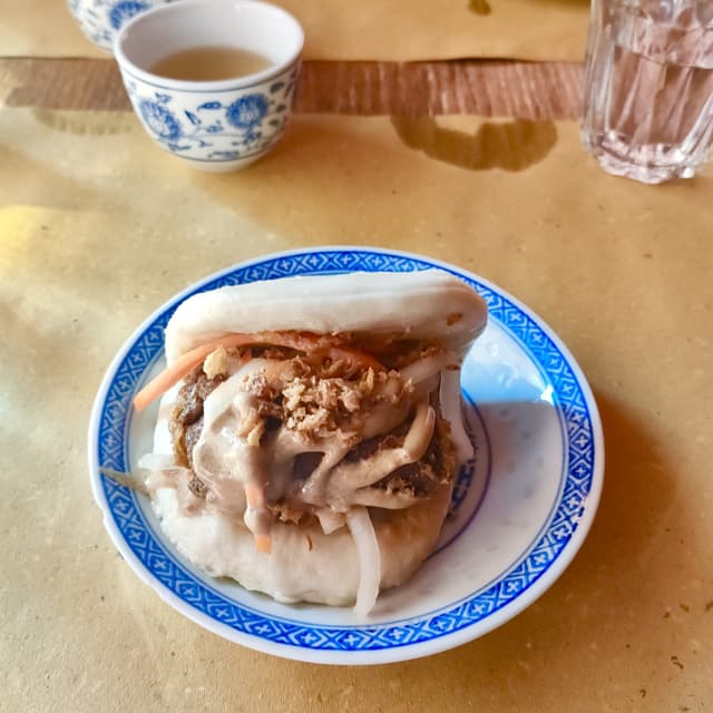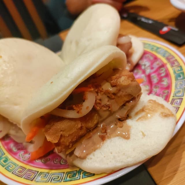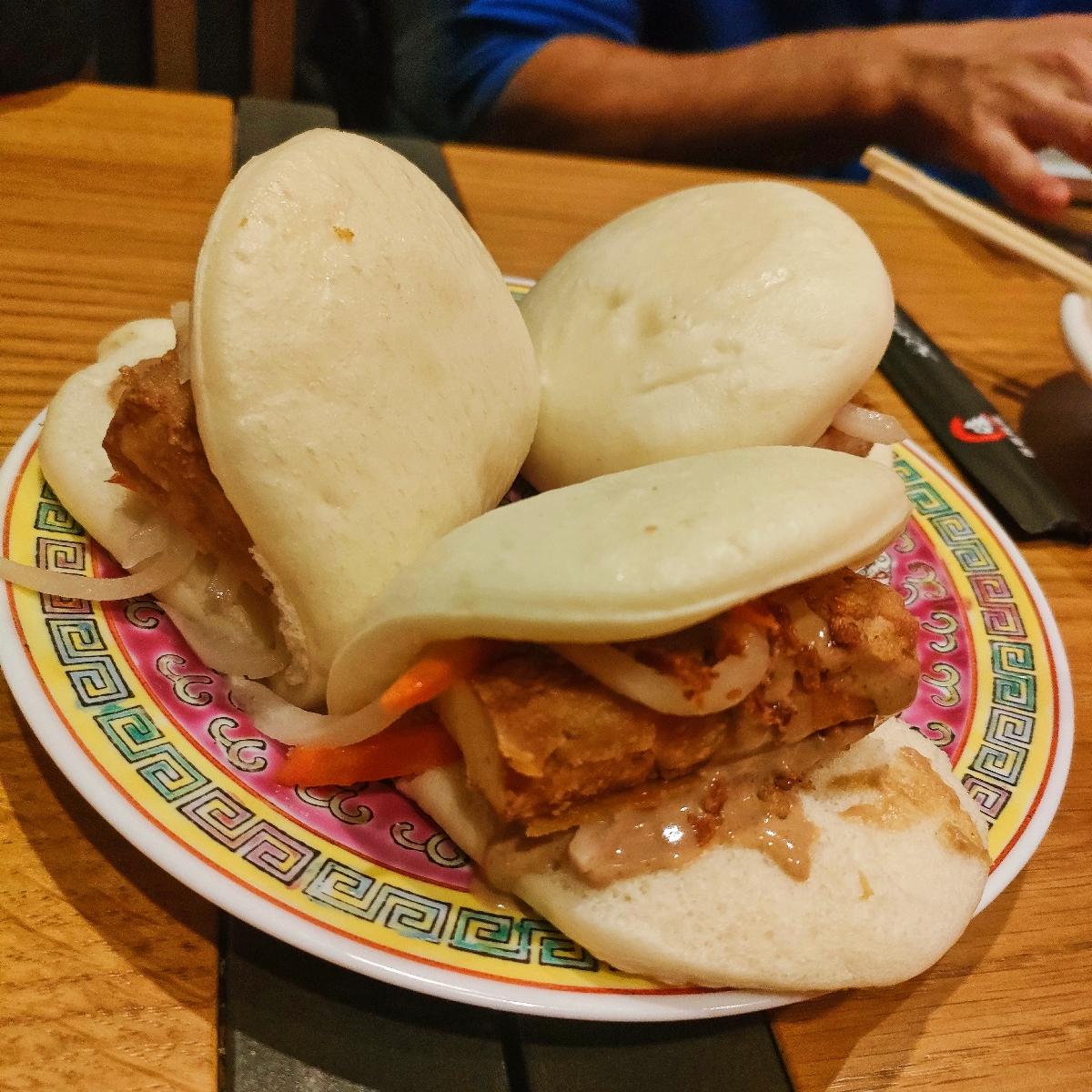 Con ripieno di tofu marinato in salsa di soia,salsa al sesamo e arachidi, cipolla fritta e daikon e carote sott'aceto.