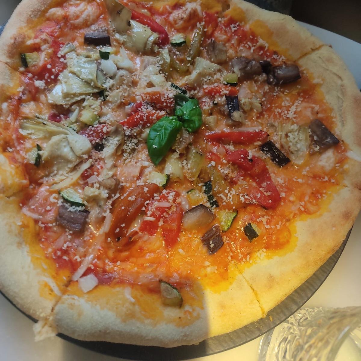 1st class Italian pizza from Choose which is a vegan Sicilian restaurant in the heart of Madrid . This was topped with artichokes , mushrooms , onion , tomato and basil .