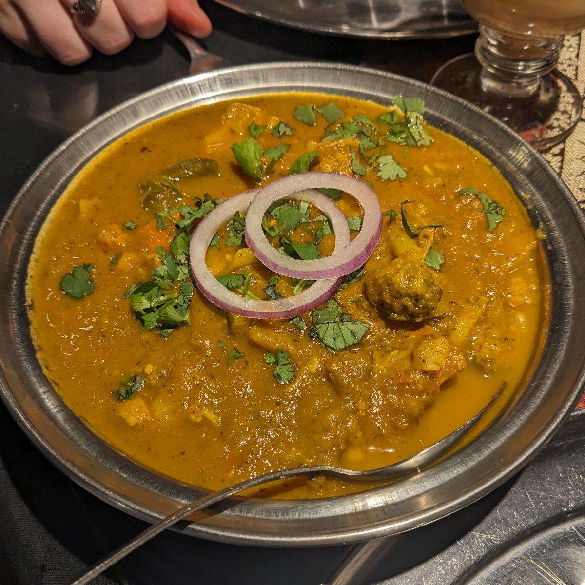 This is a super flavourful and veggie packed dish! We got it medium and the spice level was good. #vindaloo #indianfood #curry #veganindiancuisine #vegetablevindaloo