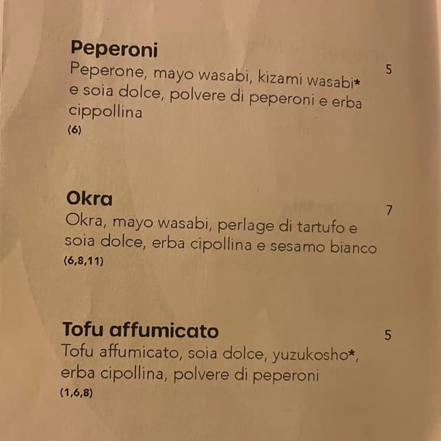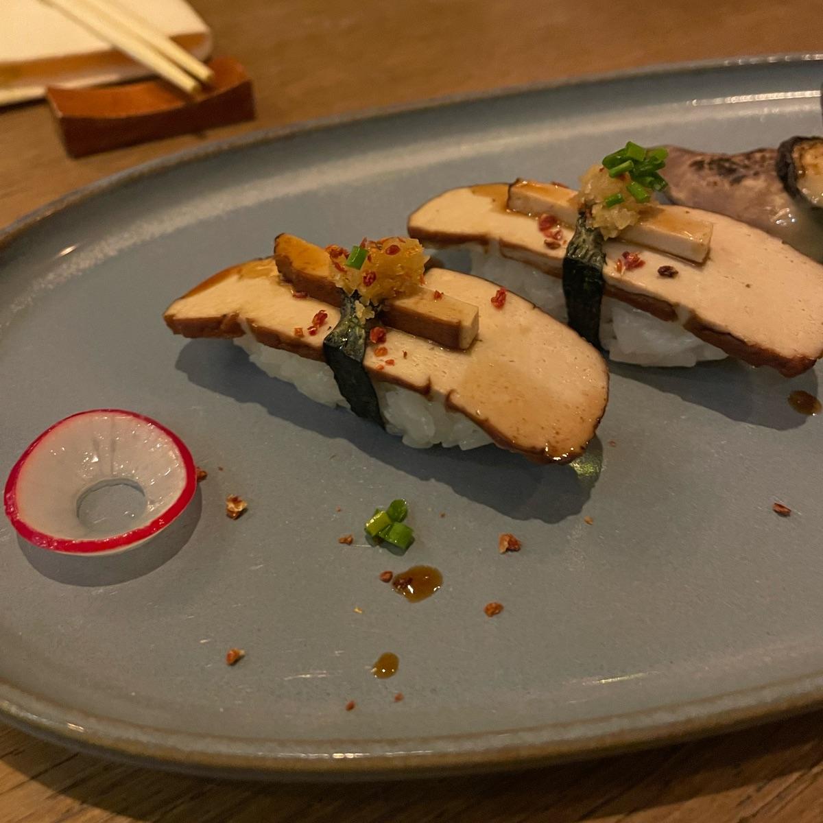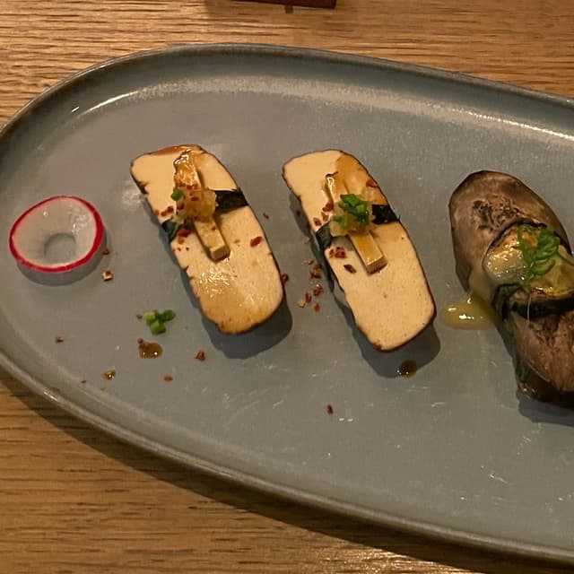 Buonissimi nigiri al tofu affumicato, soia dolce, yuzukosho, erba cipollina, polvere di peperoni.