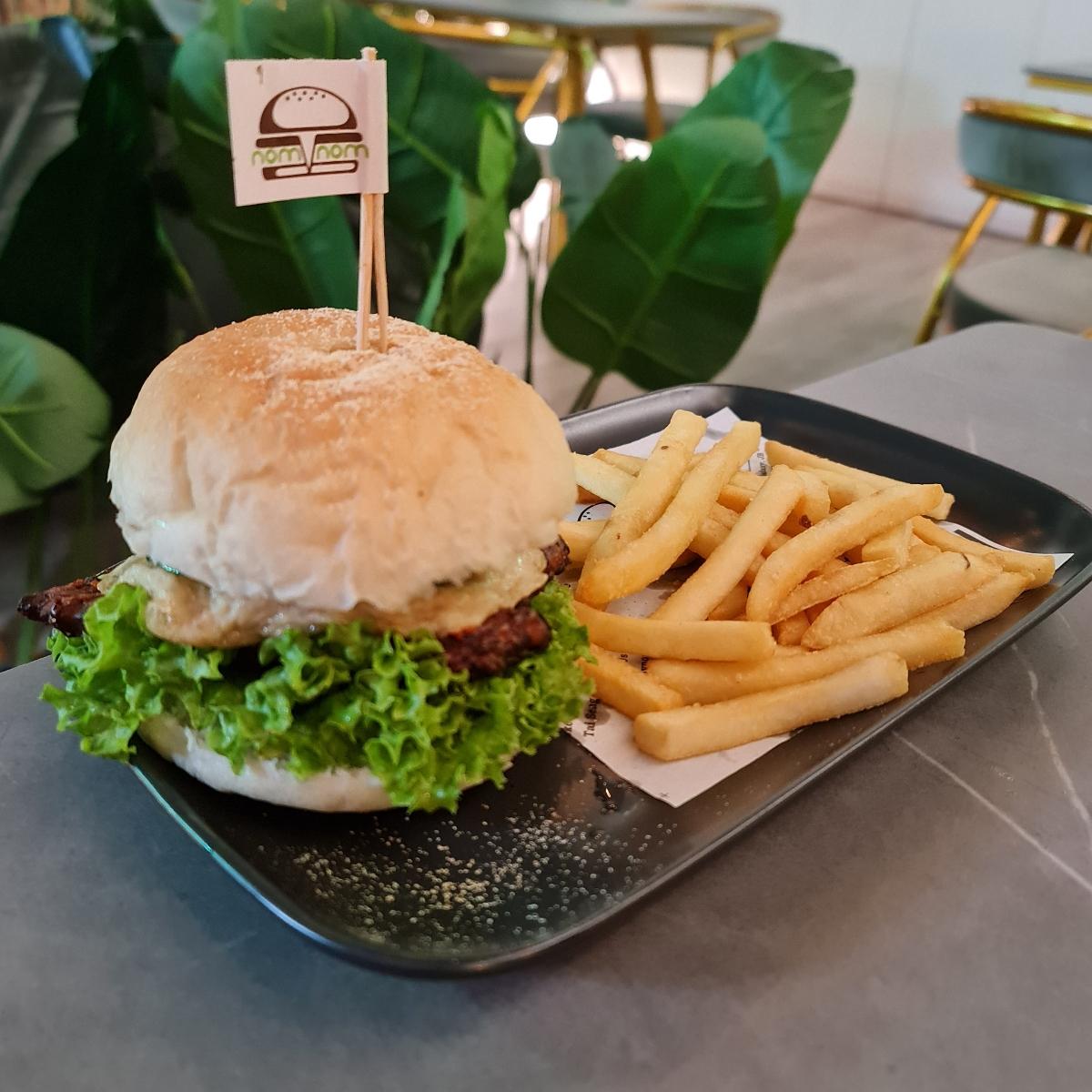 Haven't had #satay or any of the same category sauces in like decades but this was handmade. Meaning 👉 nutfree version coating a dry slab (or 2) of #tempeh. Thick and dry on the same dry and thick #burger #buns with a mountain of #fries (perfect execution). Best thing on the platter 👉 adorable (TW or IN?) #plantegg. Still, never again!