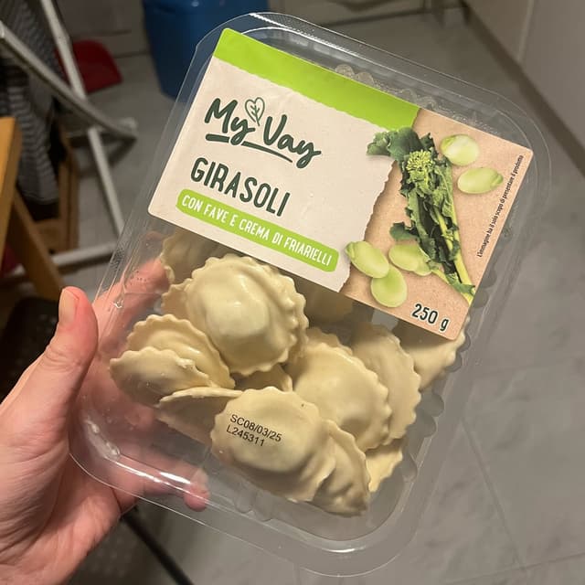 La pasta di questi girasoli è molto robusta quindi per ammorbidirli li cuocerei qualche minuto in più rispetto a quello che c è scritto sulla confezione. A parte questo il ripieno mi è sembrato abbastanza buono, li ho conditi con panna di soia e parmigiano