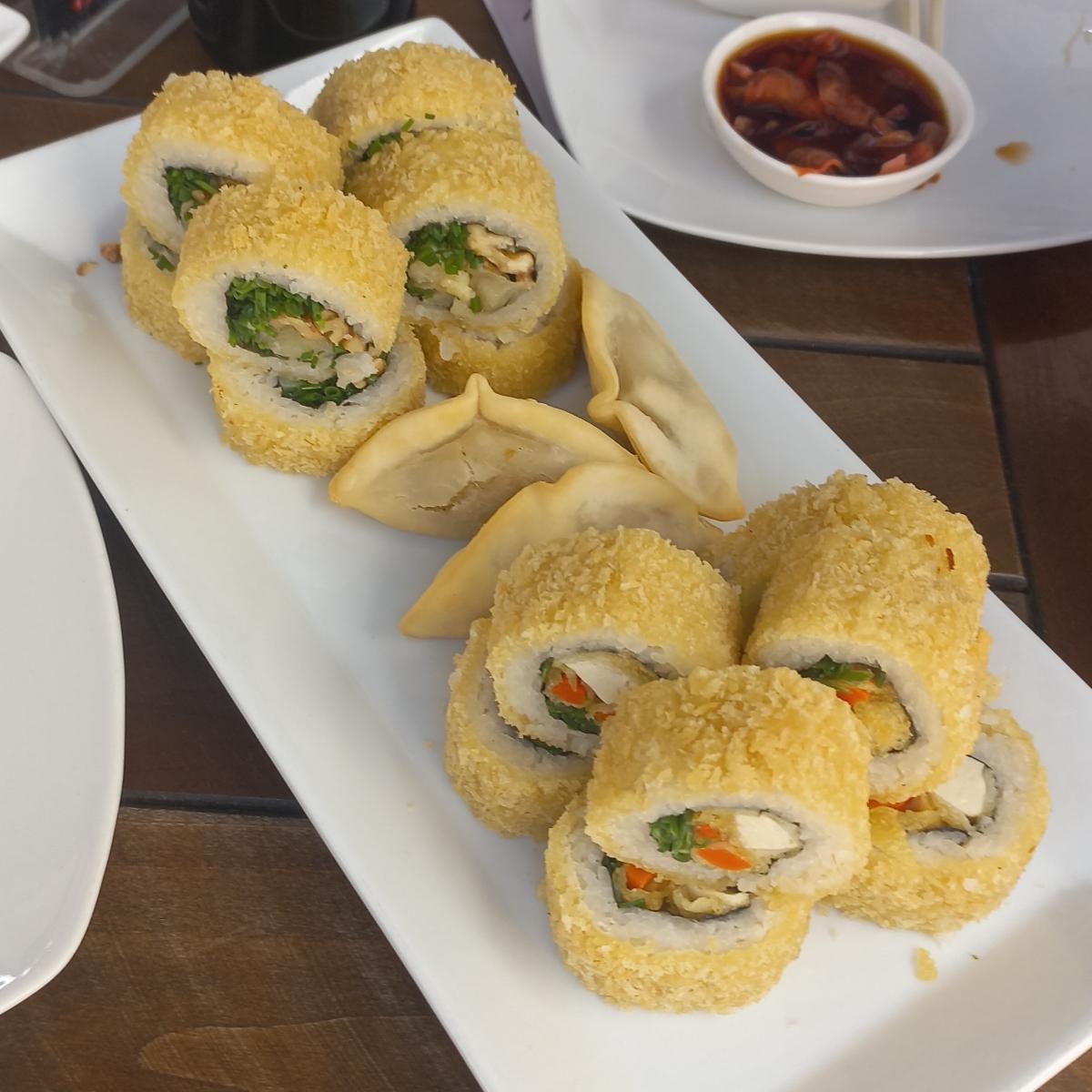 Tabla caliente de sushi vegano que integra verduras y frutos secos, lo cual brinda texturas interesantes y sabrosas. Muy recomendada en relación costo-calidad. #vegansushi
