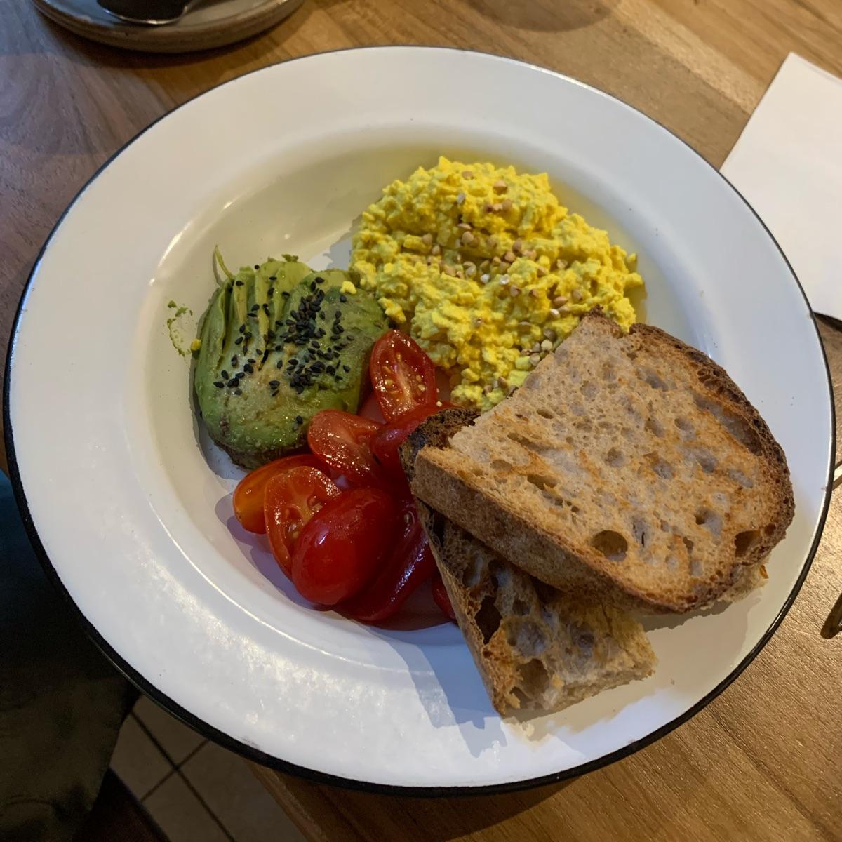 Es un muy buen desayuno, el tofu revuelto está muy bien logrado, bien cremoso. $ 12.500 Dic-24.