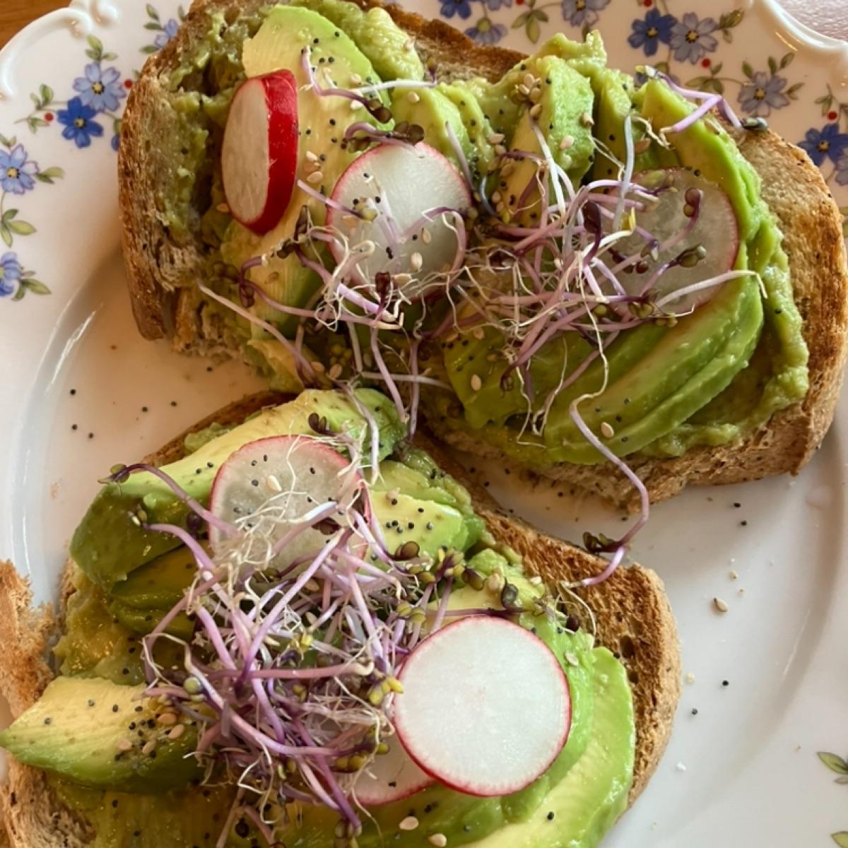 Crostini di pane integrale con avocado, ravanelli e germogli, piatto molto buono e saziante!