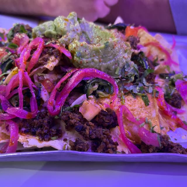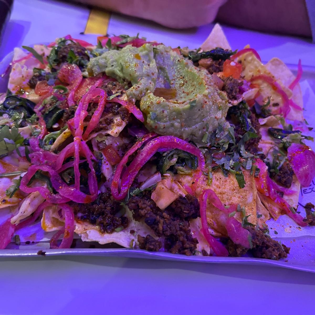 Good sized for sharing. Has guac, pickled red onions, vegan cheese, jalapenos, queso and ground “beef”. I enjoyed most elements except the “beef” which I found a bit cardboardish.