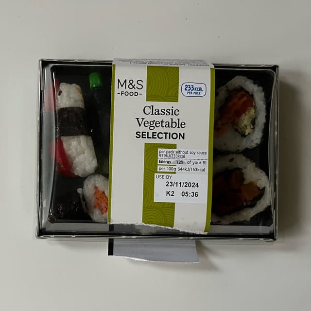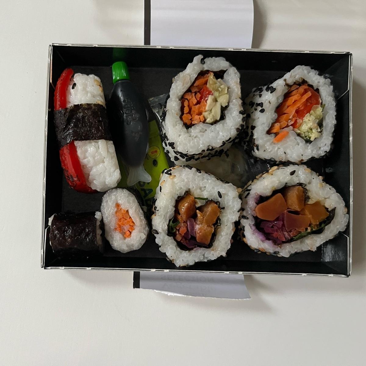 A grab and go train lunch. Nothing particularly special. I will give this a miss next time because of all the individually wrapped condiments- soy sauce, sushi and wasabi all in individual single use plastic.