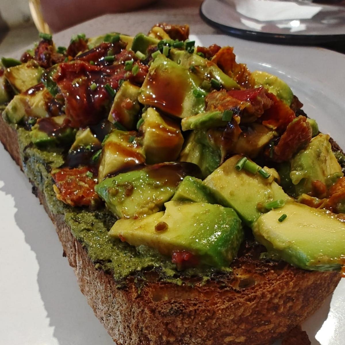 Deliciosa tostada de pan de masa madre, con de tomates secos, un montón de palta y una reducción de aceto balsámico que le da un toque ácido y dulce. Me encantó.