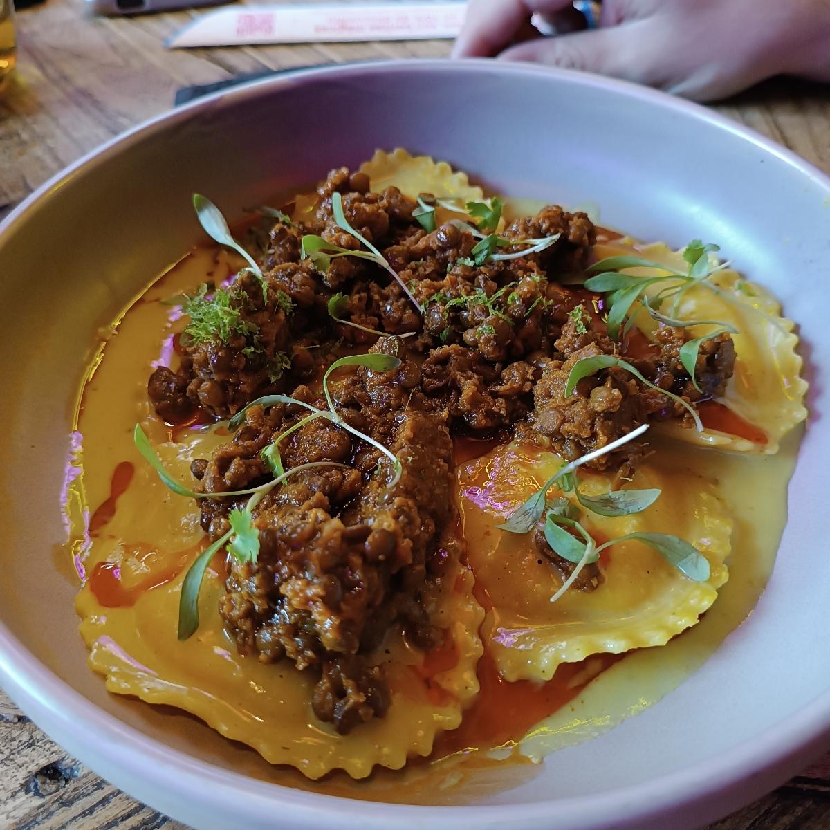 Raviolis hechos a mano rellenos de ricotta de almendra casera, bechamel al curry y delicioso daal de lentejas. Está muy bueno, aunque es un plato bastante caro.