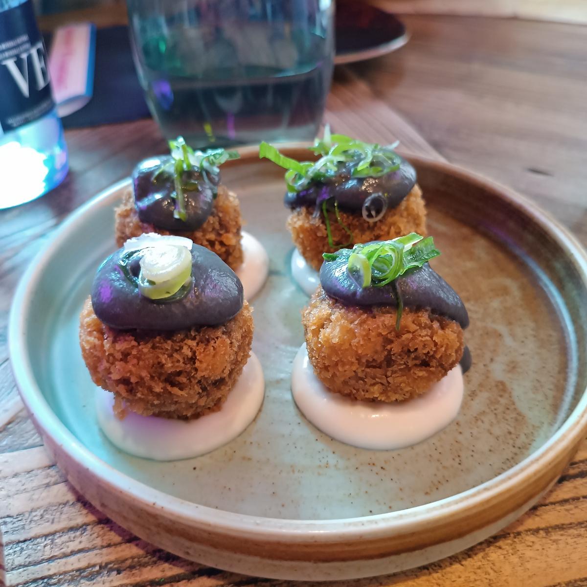 Croquetas de arroz con berenjena, acompañadas por una salsa a base de berenjena. Están buenísimas.