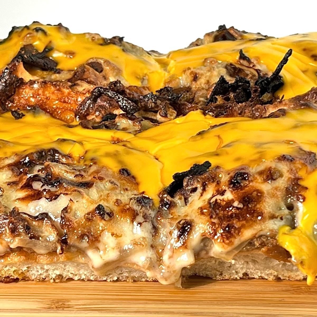 This consisted of luscious melty Good PLANeT Foods 🐄🥛-free mozzarella and cheddar, mushrooms, onions, and Buddy’s Steaks 🐮-free steak and 🐄🥛-free cheese whiz on a thick sourdough crust with crisp edges and a light and airy crumb inside. This fabulously delicious pizza/cheesesteak Super Bowl collaboration with Buddy’s Steaks was as successful as the Philadelphia Eagles it was inspired by.