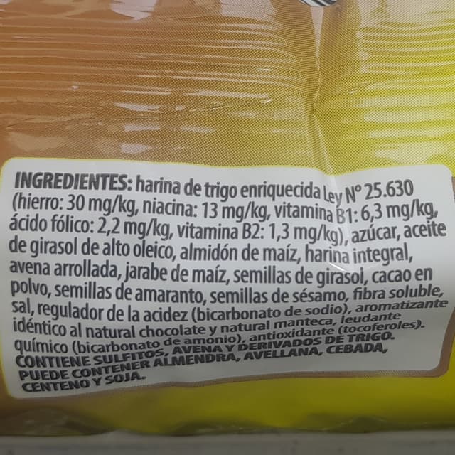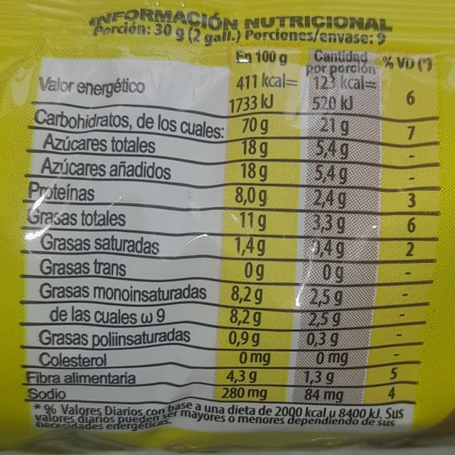 Tiene azúcares, grasas, exceptuando grasas trans, no tiene colesterol, tiene 4,3 gr de fibra alimentaria, 280 mg de Sodio, tiene 8,0 gr de proteínas, todo esto en 100 gr.
