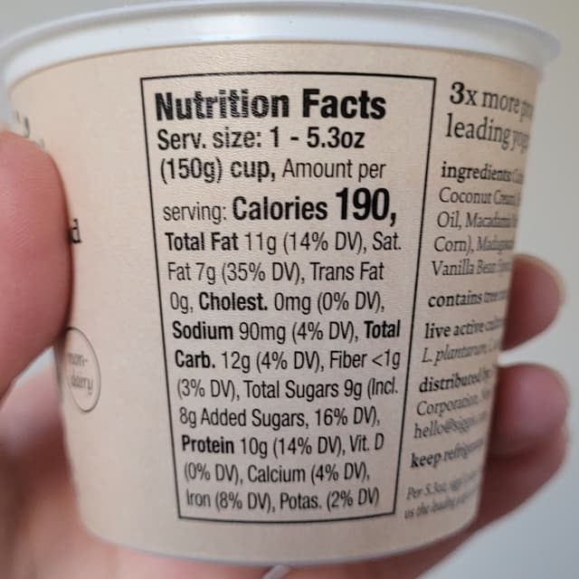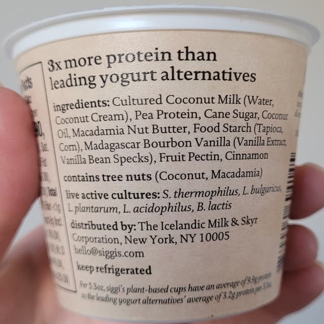 This flavor was better than the peach version, but still not the best #plantbased #yogurt I've tried. I do like the #vanilla and #cinnamon and I think it would be a nice base if you were to add granola or fruits on top. Nutritionally it's pretty solid for a yogurt, it has 10g of #protein and live cultures. There are 9g of added sugars which is a little high but surprisingly low compared to other vegan yogurts like silk (those have like 2x as much). This is made with a blend of #coconut and #macadamia nut along with #peaprotein. The texture was pretty spot on, they did a good job with that. Overall it was ok but I didn't like the taste enough to buy it again.