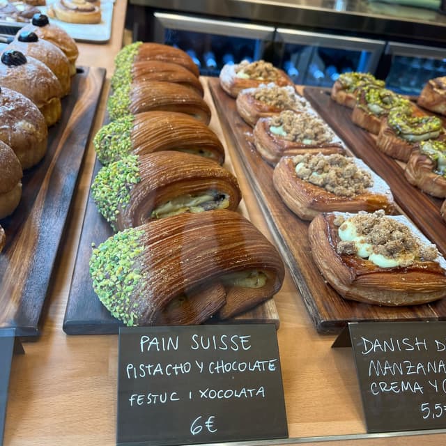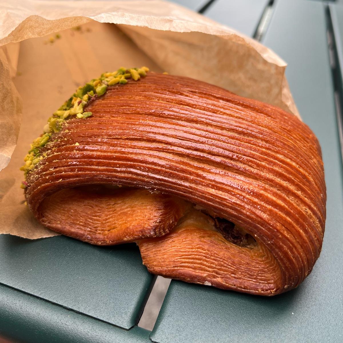 I brought home this #veganpastry from the fabulous new #veganbakery after having an excellent breakfast there. The dough itself was flaky and light, but the cream itself did not really taste like #pistachio a lot, just like cream. And the chocolate was just a tiny piece. It was an amazing dessert at a pricy cost (6€), it just didn’t taste much like pistachio or chocolate.