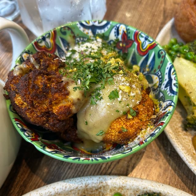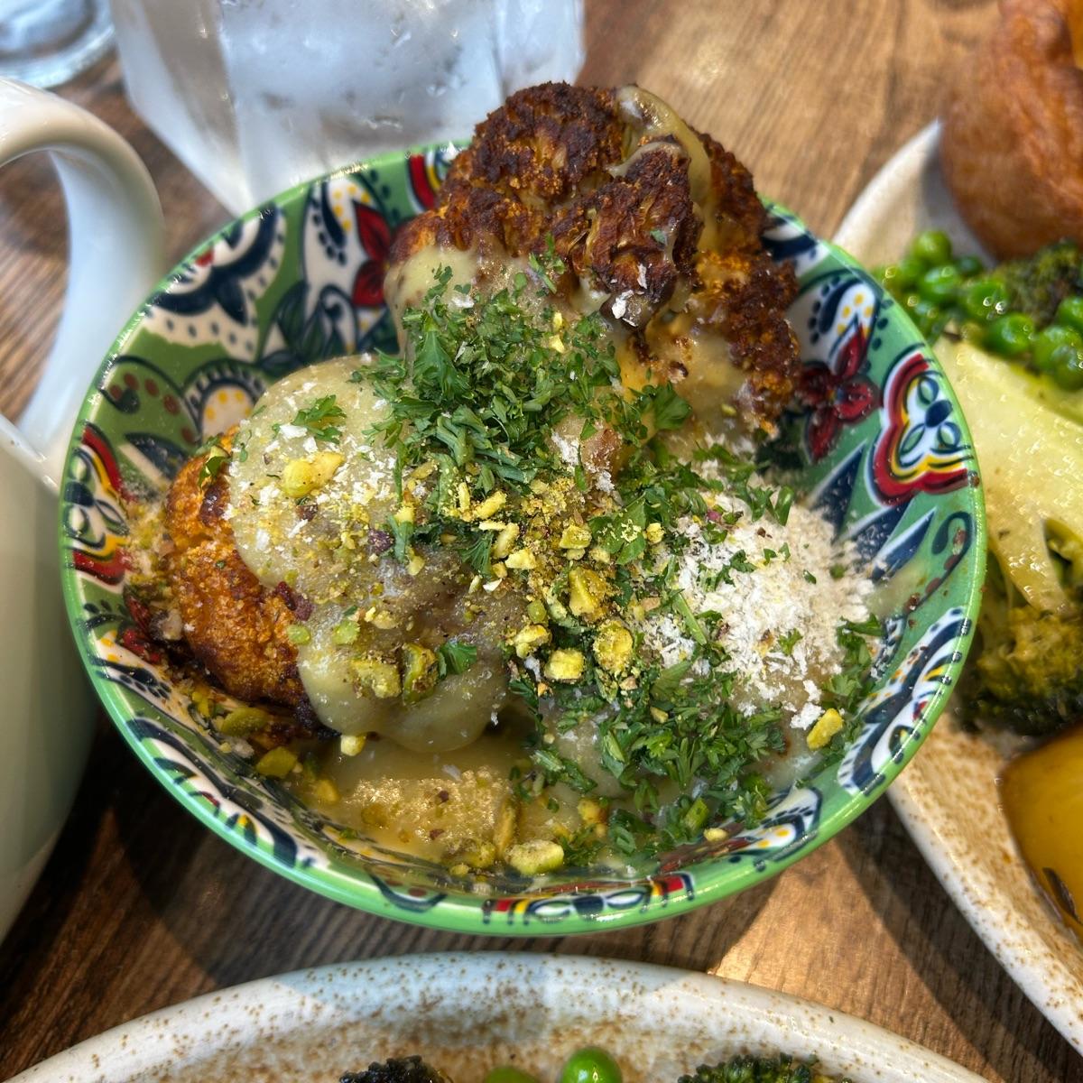 “Spicy tahini roasted cauliflower served in a creamy cheese sauce, topped with pistachio breadcrumbs.” An add on to the roast for £7.50. It’s pricey but so worth it. We easily shared one between the two of us which was good. Was so tasty!!