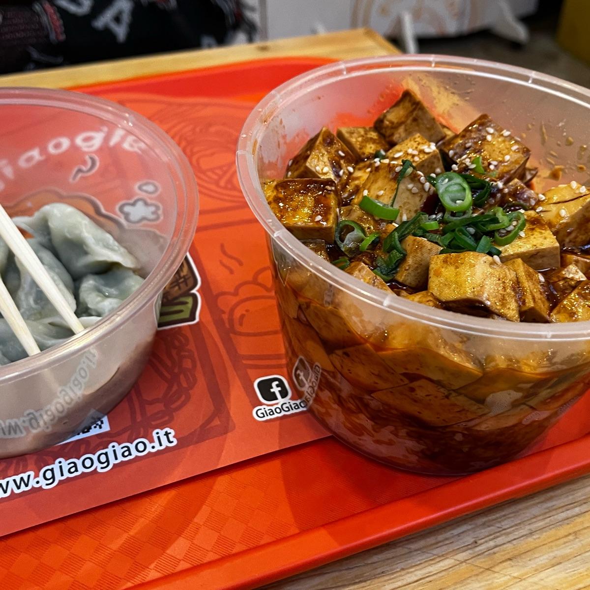 riso saltato con tofu vellutato, erba cipollina e salsa di soia. leggermente piccante (abbiamo preso anche dei raviolini di verdure).