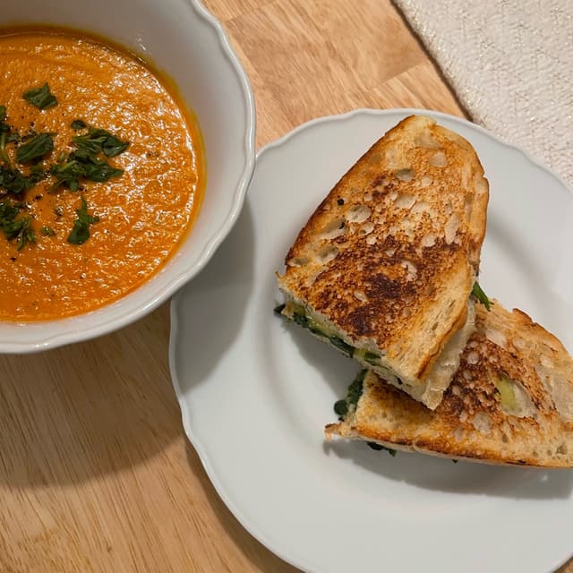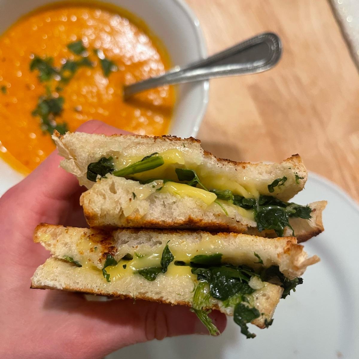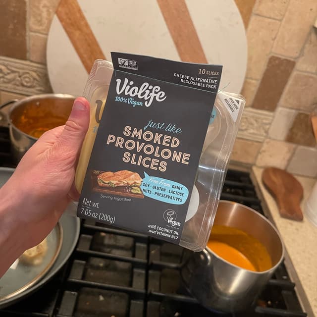 My sister and I were craving a cozy meal of tomato soup and grilled cheese on a chilly fall evening. She made a lovely veggie-filled tomato soup to which I added blended silken tofu for some extra protein and creaminess. Then of course it needed to be accompanied by a grilled cheese sandwich! I made mine on roasted sourdough with this Violife smoked provolone and some sautéed garlic kale. I’m normally not a fan of vegan cheese but this one was actually so good!! The smoked flavor made it much more distinct from a basic provolone and it actually melted! This was such a comforting and flavorful meal!