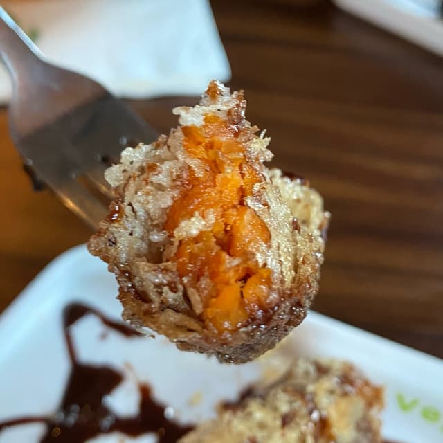 Super rico!Es como una tempura de batata, pero la masa está como en hilos, lo que hace que sea muy fina y crujiente