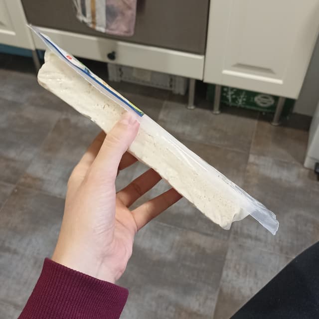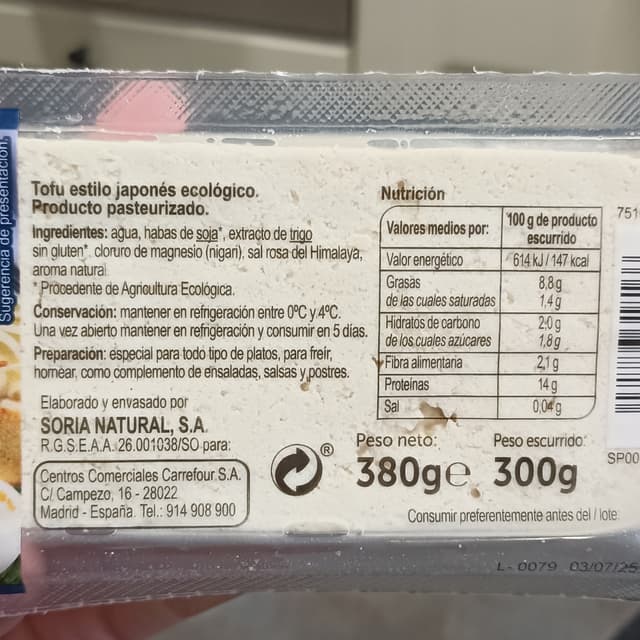 Lo compré pensando que sería silken-tofu o tofu sedoso, ya que el estilo japones es el que suele tener está textura. Ligeramente más poroso que otros tofus de carrefour, pero consistencia bastante firme. Lo utilicé para batir y hacer la base de una tarta estilo cheesecake y quedó muy rico.