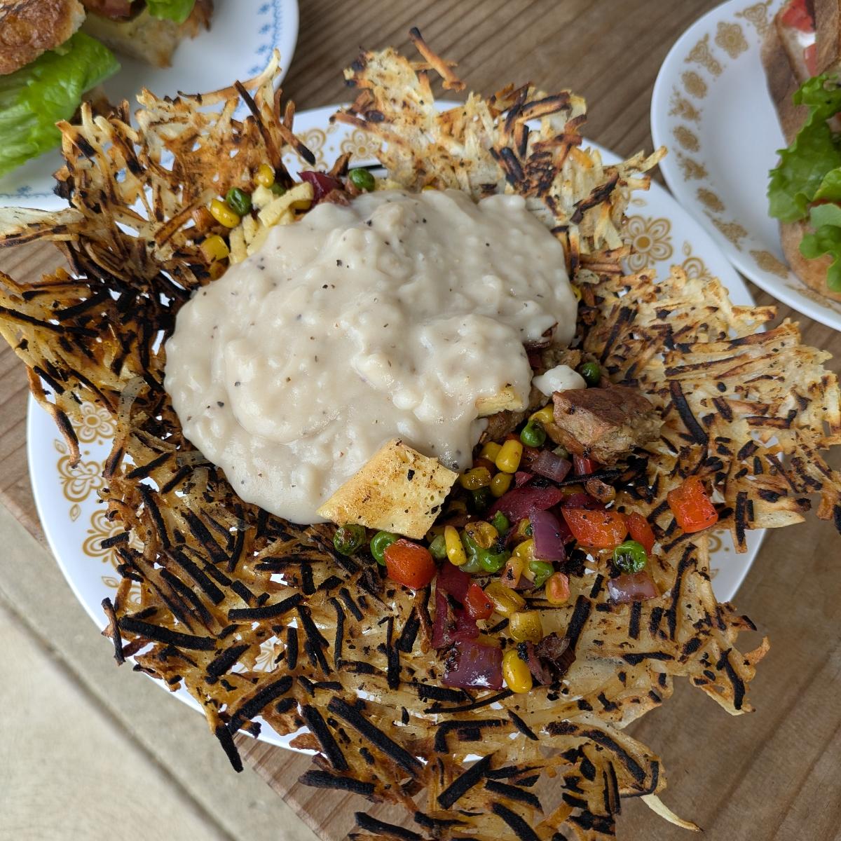 I had this when it was in beta testing years ago, and now it is permanently on the brunch menu, and even better than before! Crispy fried hash browns make the bowl and it's filled with house made sausage, just egg, sweet potato, red peppers, Brussels sprouts, beets, onion, and corn all topped with a delicious sausage gravy. So filling and SO tasty!