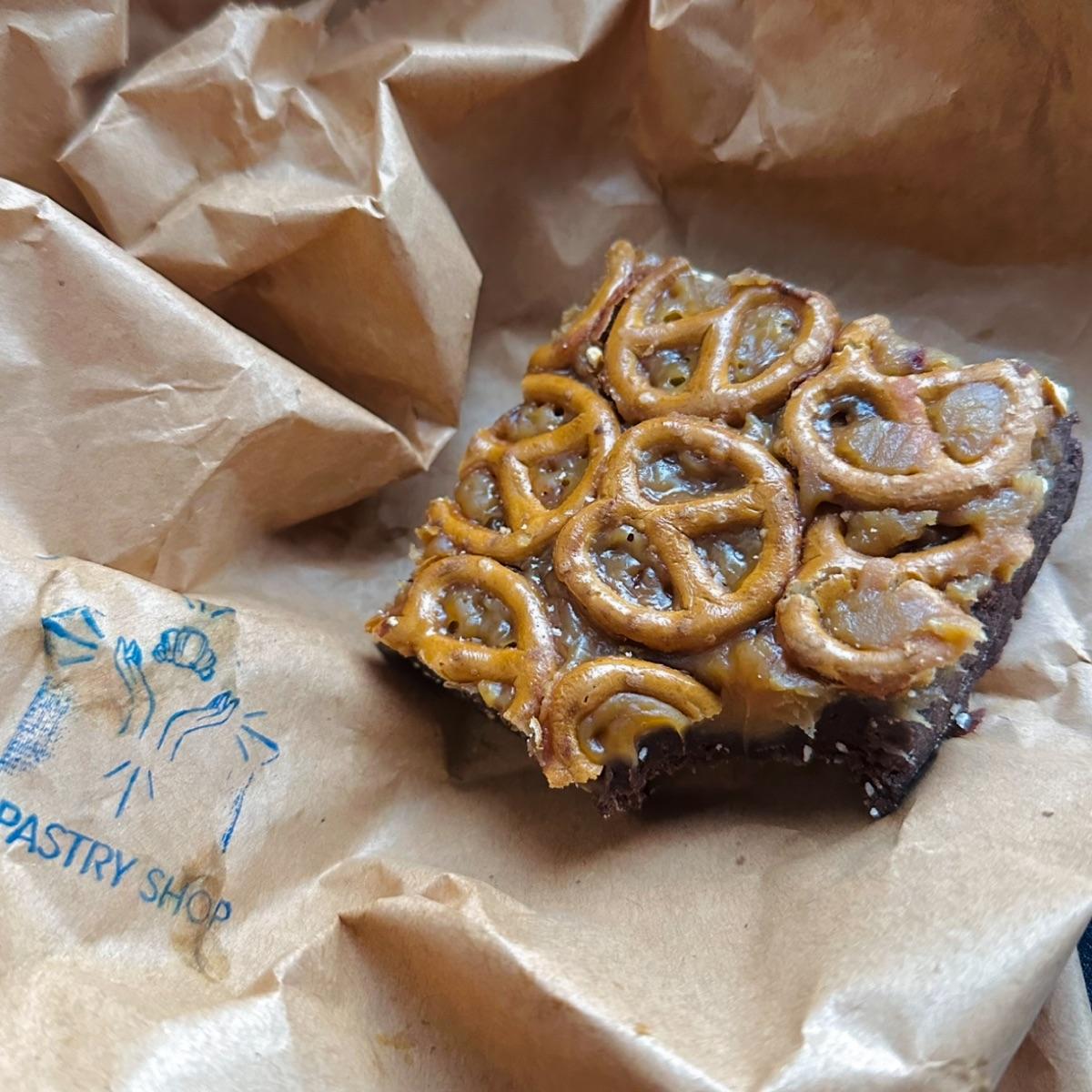 🍫🥨 Brownies just how I like them - super rich and fudgy and gooey almost to the point of being WET! but not tasting underbaked somehow 🙏 the salty miso flavour was a really nice twist to balance out the chocolatey sweetness, and the pretzels on top were great too. Very rich and intense, good for sharing (I like getting different things at A Pastry Shop and going half n half) #veganbakery #bakery #pretzels #miso #brownie #scotland #glasgow