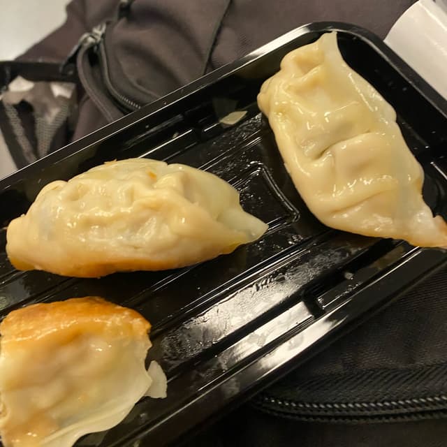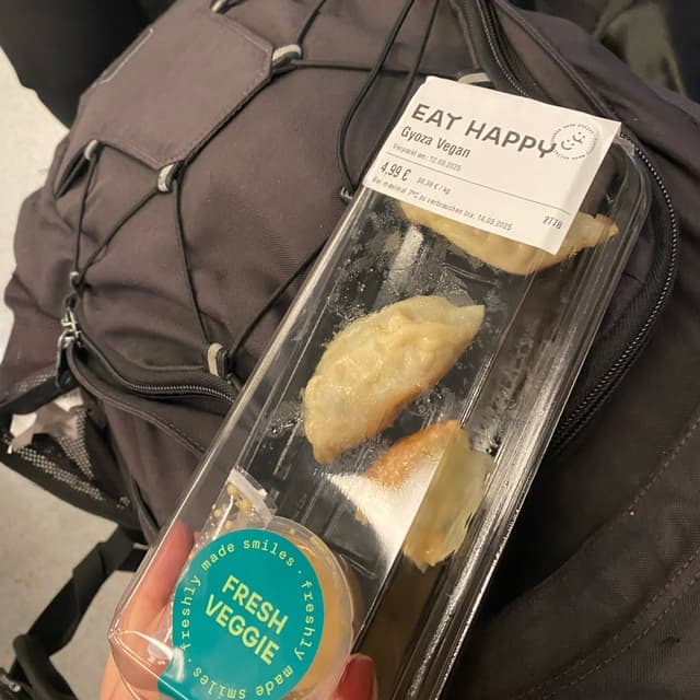 Nice vegan gyozas sold at REWE to go, but way overpriced. This pack was 5€, they were good, especially the peanut sauce, but too expensive and the nutritional value was not great either.