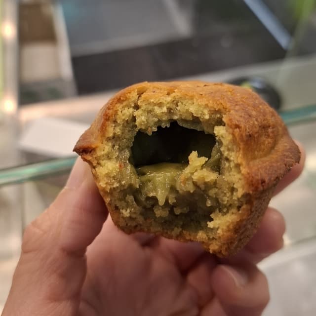 La frolla mi ha lasciata un pò perplessa, non so se siano cambiati i miei gusti o proprio la ricetta da quando l'avevo mangiato un anno fa, perché per quanto fosse ben cotta mi ha lasciato in bocca quel sentore di frolla cruda (spero sappiate di cosa parlo perché non saprei come spiegarmi meglio). La farcitura è una crema pasticcera al pistacchio, non è malvagia ma avrebbero potuto osare di più in tutti i sensi: nel caricare il sapore con più pistacchio e nella quantità della crema stessa, che riempiva a malapena la metà della cavità interna del pasticciotto.