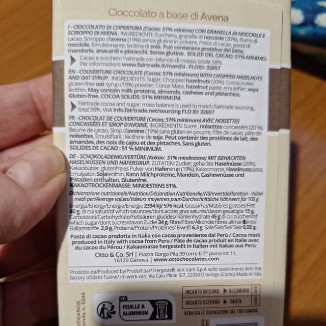 In genere si trova solo cioccolato fondente, questo seppure un po dolce, sembra cioccolato al latte ed è pieno di granella di nocciole