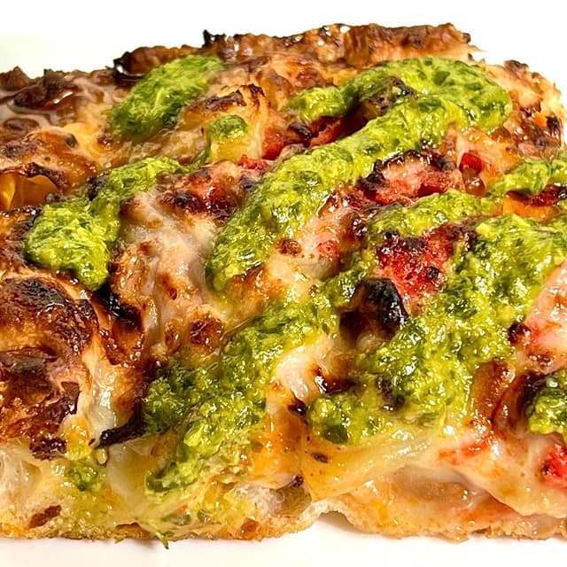 This consisted of luscious melty GOOD PLANeT 🐄🥛-free mozzarella and cheddar, spicy pepperoni, pineapple 🍍, creamy tomato-based vodka sauce, vibrant, herby pesto, and 🐝-free hot honey on a thick sourdough crust with crisp edges and a light and airy crumb inside. With a fabulous combination of delicious flavors, it’s a real party in your mouth. It can be made gluten-free.
