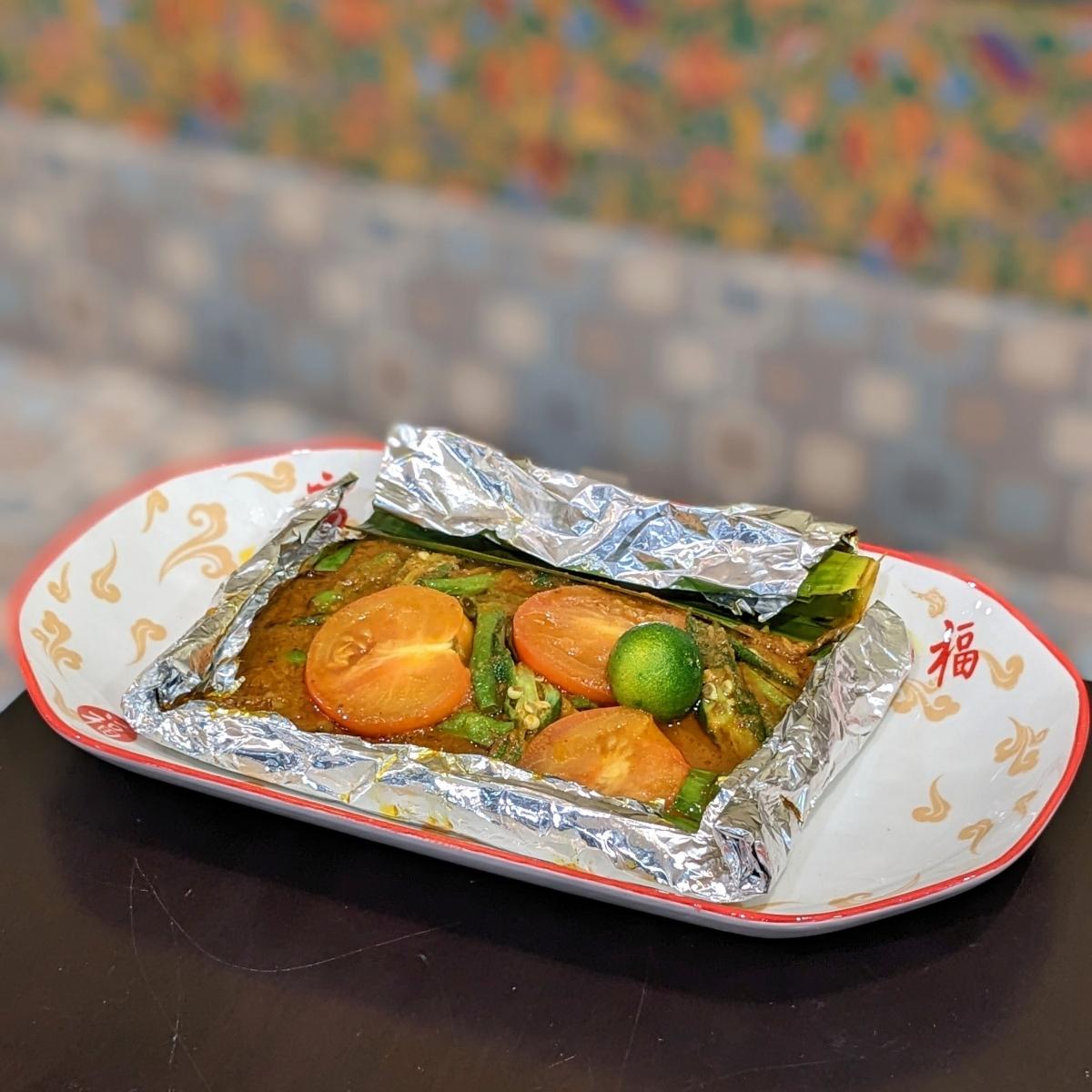Textured soy protein 'fish' slices baked in a banana leaf wrap alongside rempah spice paste! 🐟🌿🌶️ Took a little time to arrive as they baked it on the spot. Also came topped with lady's finger, long beans, and tomatoes. 🫛🍅 Fragrant and aromatic, but again kinda pricey considering there were 3 thin slices of 'fish'; personally would have appreciated a slightly more generous portion. (Allium-free, $21.90) #sgvegan #alliumfree #peranakan #nyonya
