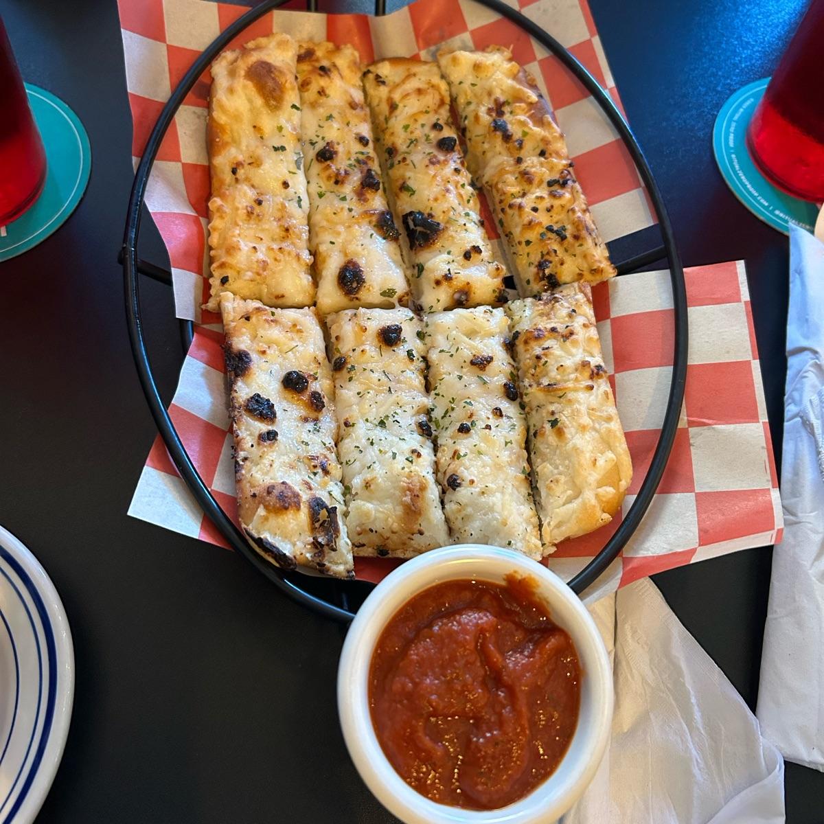 Cheesy and garlic warm bread , comes with 2 marinara sauces. It’s really good !