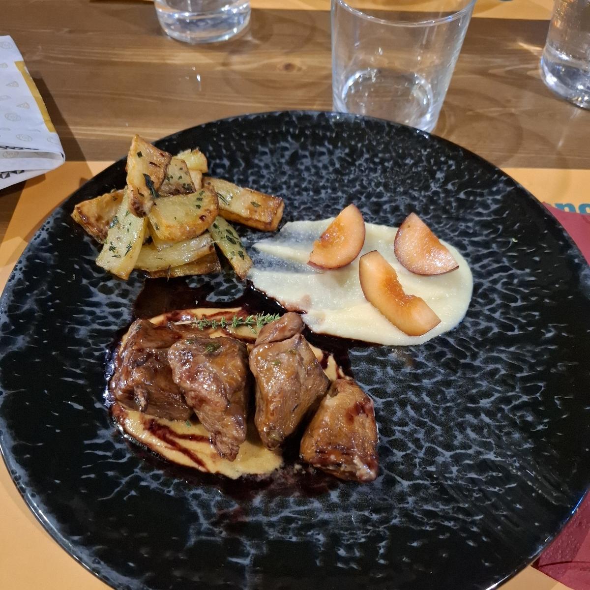 Versione di brasato che mi è piaciuta molto! Tanto per cominciare il seitan è morbidissimo e succoso, si sfilaccia che è un piacere e pur non essendoci un sughetto come nella ricetta del brasato che faccio abitualmente i classici aromi si sentono tutti. È servito su una purea di verdure e patate e irrorato con una riduzione al vino rosso, di contorno ci sono delle patate al forno e delle prugne scottate, scelta originale per dare un tocco di freschezza.
