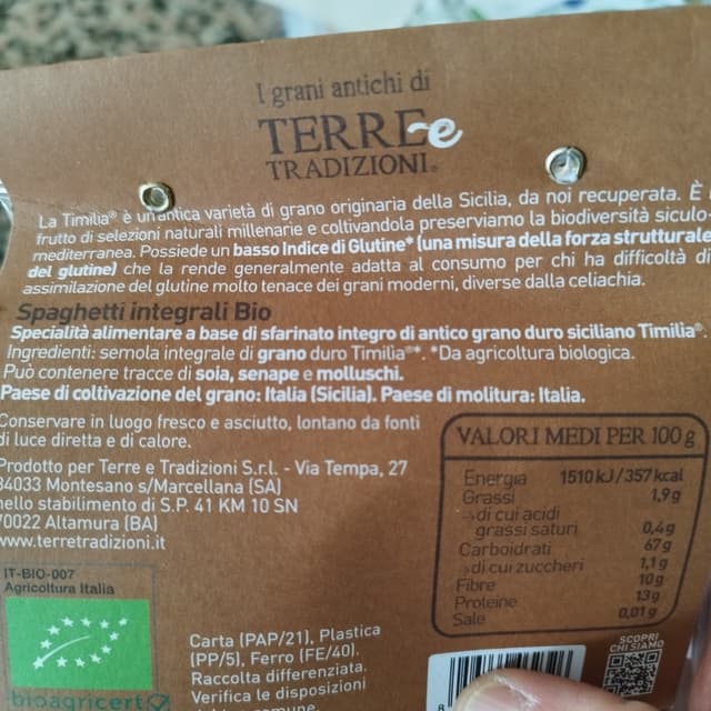 Spaghettone bello corposo, ruvido. Cuoce in 15 minuti. Il grano usato è quello "timilia" che ha meno glutine rispetto ai grani moderni di oggi. Ricomprerò sicuramente