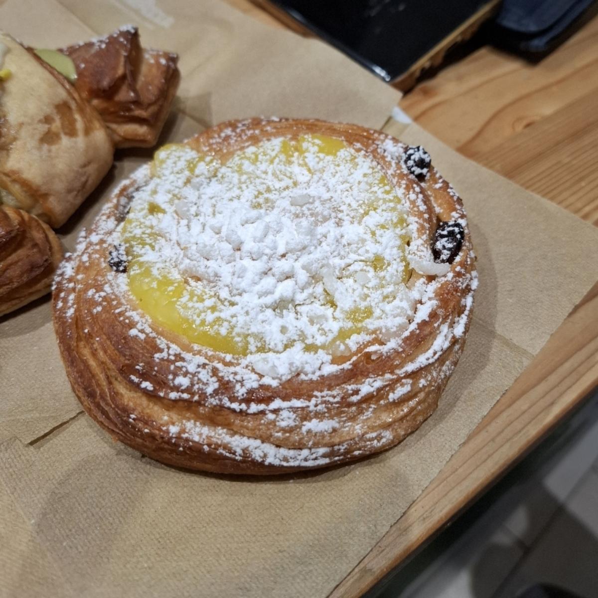 Questa brioche ci è piaciuta molto: l'impasto è tipo pasta sfoglia ed è farcito con abbondante crema pasticcera (buona, profumata al limone e non gelatinosa) e gocce di cioccolato. Un dolce così è un miraggio nella stragrande maggioranza delle pasticcerie.