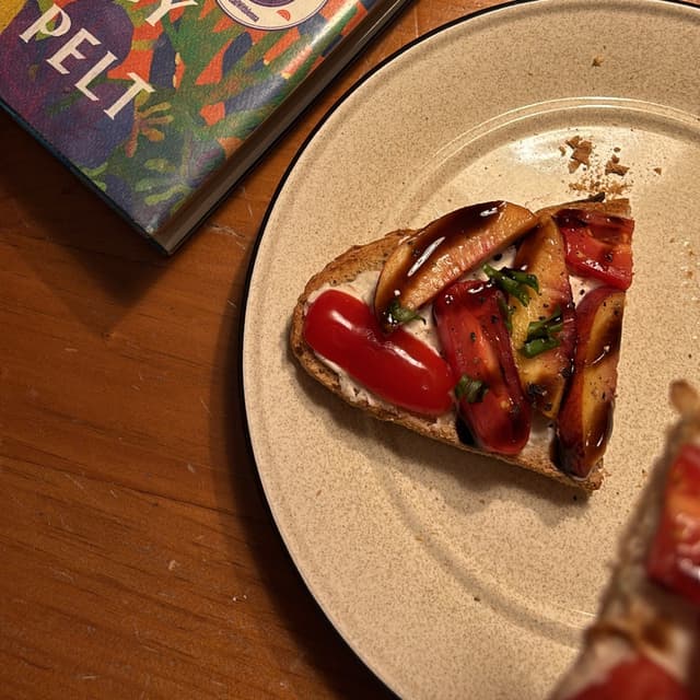 A slightly tart, super spreadable “goat” cheese. I used it to make a variety of toasts—the more toppings, the better! With tomatoes was nice. With peaches was even better. And to finish, a drizzle of balsamic reduction and crack of pepper.