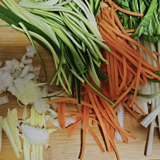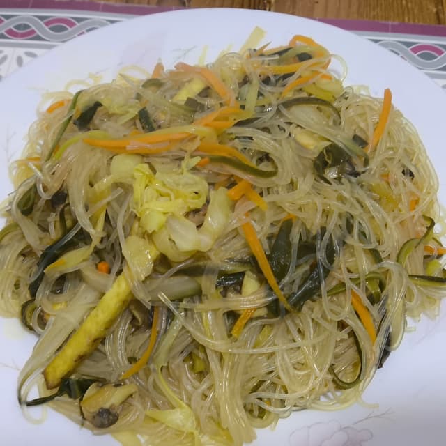 I classici vermicelli di soia, che poi in realtà son fatti di amido di mais e di amido di piselli, molto versatili, li uso spesso dato che siamo amanti della cucina cinese in famiglia, stavolta li ho fatti alla Kung Fu Panda, tante verdurine fatte a julienne con la pelatrice (ha un lato che fa le striscioline) poi saltati con un filo di salsa di soia, vino e alla fine aggiunti con funghi champignons e tofu affumicato croccante a listarelle (fatti in friggitrice ad aria).